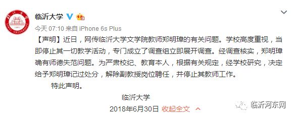 近日,网传临沂大学文学院教师郑明璋的有关问题。学校高度重视,当即停止其一切教学活动,专门成立了调查组立即展开调查。经调查核实,郑明璋确有师德失范问题。为严肃校纪、教育本人,根据有关规定,经学校研究,决定给予郑明璋记过处分,解除副教授岗位聘任,并停止其教师工作。